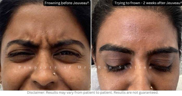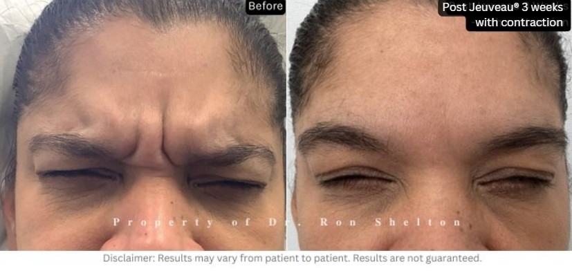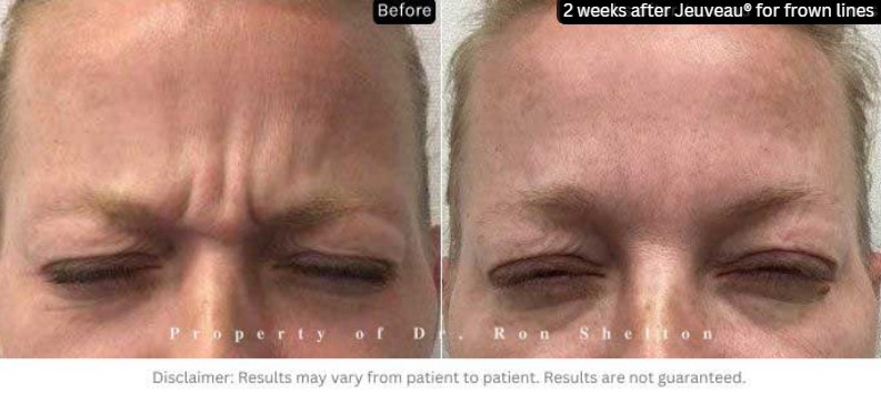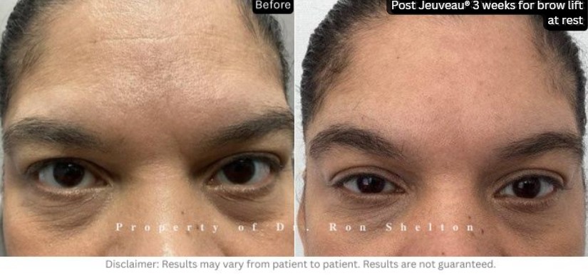 - Jeuveau® brow lift: 3 weeks after Jeuveau – at rest. There is more skin visible above the eyelashes after the upper eyelids were pulled up